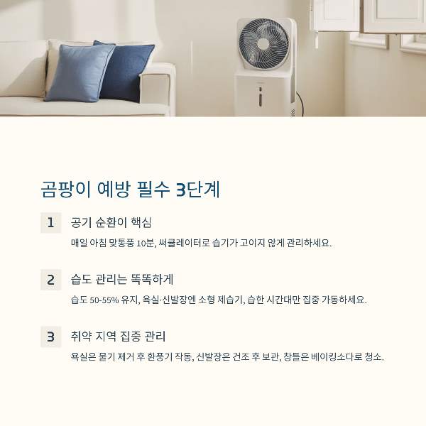 곰팡이는 한 번 생기면 뿌리까지 번지기 때문에 “초기에 막는 것”이 가장 중요합니다.